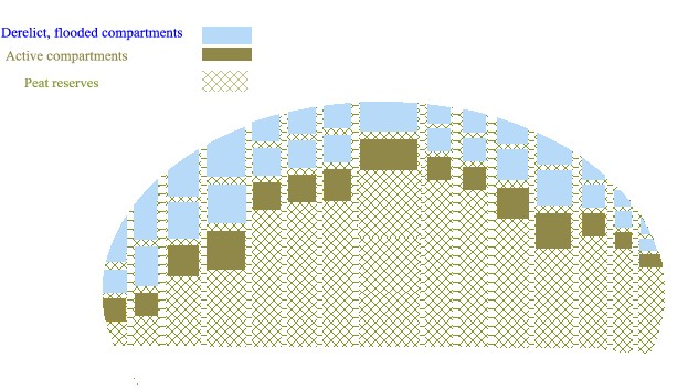 As reserves began to run out, the lateral walls were removed in some turbaries and the peat converted into turves, creating broader areas of open water. In others, all these lateral walls were removed for fuel, leaving only essential boundary markers.